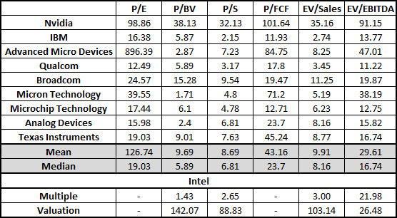 Passiamo ora al confronto multiplo per Intel. Innanzitutto, abbiamo creato un ampio gruppo di aziende statunitensi di chip tra cui Nvidia, IBM, Advanced Micro Devices, Qualcomm, BroadCom, Micron Technology, Microchip Technology, Analog Devices e Texas Instruments. Tuttavia, il rally di quest'anno delle azioni Nvidia e AMD ha gonfiato significativamente i loro multipli e questi hanno spinto i mezzi per il gruppo di pari più in alto. Per superare questo problema, abbiamo deciso di utilizzare le mediane dei gruppi di pari. Poiché Intel ha ottenuto utili e free cash flow negativi negli ultimi 4 trimestri messi insieme, i multipli P/E e P/FCF non possono essere calcolati per Intel e le valutazioni utilizzando la mediana del gruppo di pari non avrebbero molto senso (le valutazioni sarebbero negative). Tuttavia, prendendo la media delle valutazioni calcolate utilizzando i quattro multipli rimanenti, ci porta alla valutazione Intel di 76,84 dollari per azione! Ciò segnalerebbe che le azioni Intel sono significativamente sottovalutate, ma bisogna tenere presente che Intel è in ritardo rispetto all’intelligenza artificiale e la sua valutazione attuale sembra rifletterlo (oltre a fondamentali piuttosto scadenti).