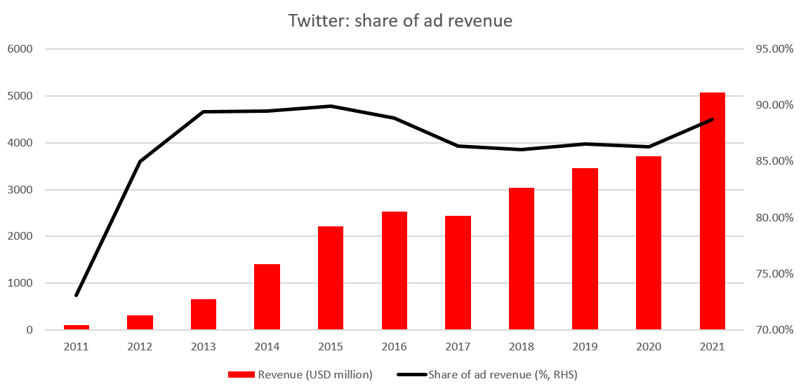 Guardando oltre le notizie di Musk-Twitter, diamo un'occhiata ai dati finanziari dell'azienda. Twitter stava perdendo denaro fino al 2018, quando ha registrato un utile netto per l'intero anno di $ 1,205 miliardi su base GAAP. I profitti sono aumentati ulteriormente nel 2019 prima che la società tornasse in perdita nel 2020. Ciò è stato il risultato della pandemia di coronavirus che ha costretto le aziende a ridurre drasticamente la spesa pubblicitaria, la principale fonte di entrate di Twitter che rappresenta oltre l'80% delle entrate. Questo dovrebbe essere motivo di preoccupazione. Il cambiamento della politica monetaria e l'inflazione elevata creano un rischio reale di recessione o almeno di rallentamento degli Stati Uniti. Nei periodi di difficoltà economica, la spesa pubblicitaria è solitamente la prima vittima delle misure di controllo dei costi adottate dalle aziende. Detto questo, Twitter potrebbe avere qualche trimestre difficile. Naturalmente, non si può escludere che l'arrivo di Musk porterà alcune nuove idee su come monetizzare i servizi di Twitter, ma probabilmente anche questi avrebbero difficoltà durante una recessione economica a meno che non siano completamente estranei al business attuale e offrano un alto grado di diversificazione .