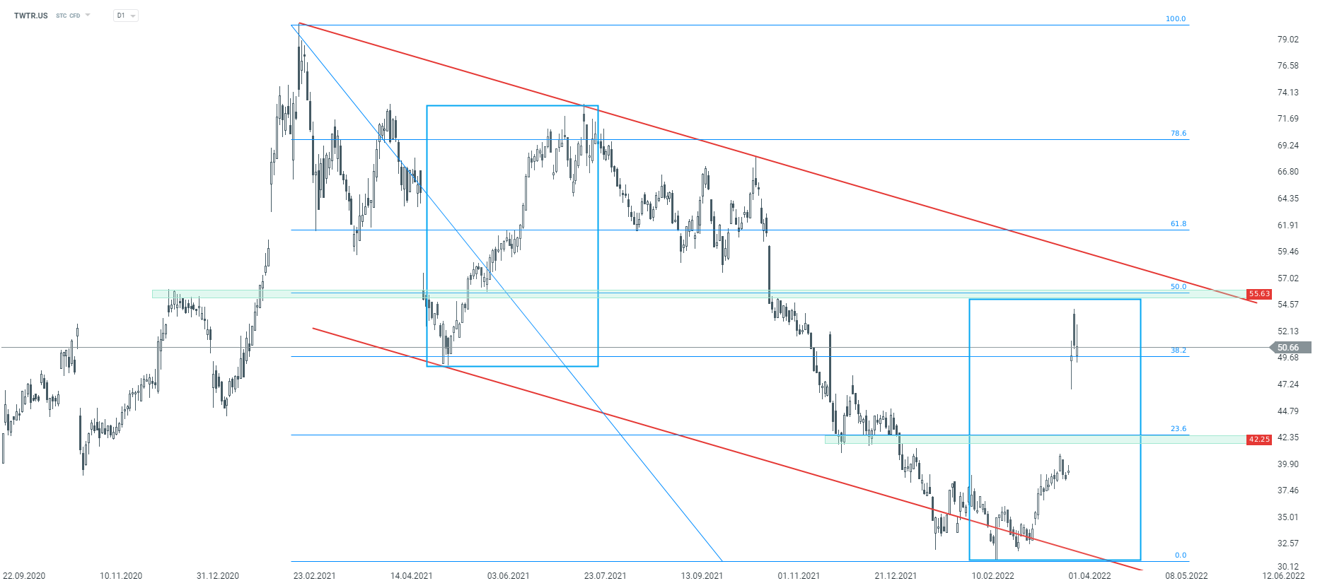Twitter (TWTR.US) si trova in un ampio canale al ribasso dall'inizio del 2021. L'annuncio di Elon Musk che ha acquisito una grande partecipazione in Twitter e il conseguente aumento del prezzo delle azioni di oltre il 20% ha sollevato le speranze che il titolo terminasse un movimento al ribasso lungo un anno. Il rally iniziale è stato interrotto prima di un'area di resistenza chiave vicino a $ 55,60. Questa zona è contrassegnata dal limite superiore della struttura Overbalance e dal 50% del ritracciamento dell'intero impulso al ribasso iniziato all'inizio del 2021. Superarlo potrebbe suggerire un'inversione di tendenza rialzista. Fonte: xStation5