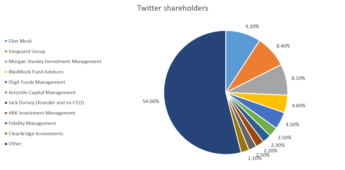 Lunedì Elon Musk ha presentato una dichiarazione alla SEC affermando di aver acquisito una grande partecipazione in Twitter. In una dichiarazione, Musk ha dichiarato di possedere ora quasi 73,5 milioni di azioni Twitter, ovvero circa il 9,2% del capitale della società. Questa enorme partecipazione ha immediatamente reso Musk il principale azionista di Twitter, superando le partecipazioni detenute da gestori patrimoniali come Vanguard o BlackRock. Il modulo di deposito iniziale suggeriva che Musk non intendesse assumere un ruolo attivo nell'azienda. Tuttavia, ciò è stato rapidamente smentito quando Twitter ha annunciato che Musk si unirà al suo consiglio di amministrazione.