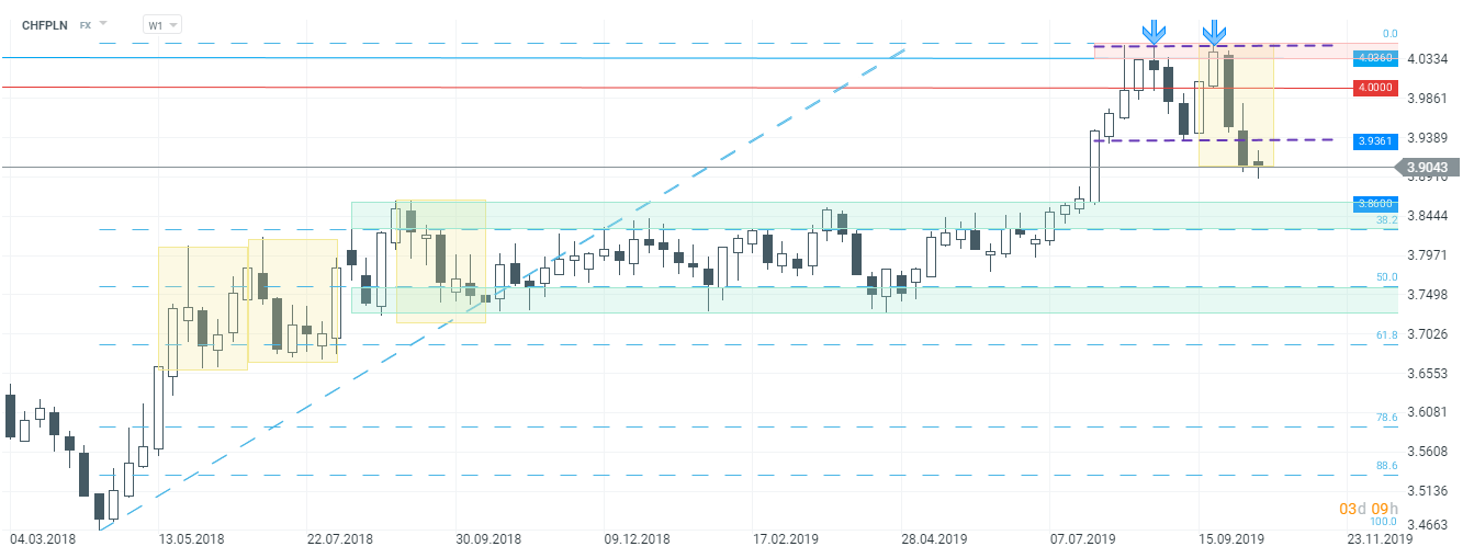 Diamo un'occhiata alla coppia di valute CHFPLN. Guardando l'intervallo settimanale, si può vedere che la coppia è stata sottoposta a una forte pressione di vendita di recente. Uno schema a doppio massimo può essere individuato sul grafico e, in teoria, suggerisce un'inversione di tendenza. Finché il prezzo rimane al di sotto della scollatura (3.9360), ribassi sono più probabili. D'altra parte, il movimento verso il basso è stato fermato al limite inferiore della struttura di Overbalance. Una mossa sotto la casella gialla può innescare un movimento verso il basso verso il limite superiore dell'intervallo di consolidamento precedentemente interrotto (3.8600). CHFPLN Intervallo settimanale (W1). Fonte: xStation5