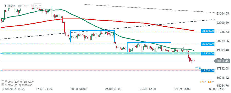 Il prezzo della criptovaluta più famosa è sceso sotto il limite inferiore della zona di consolidamento a $ 19.500-20.500, che è più o meno della stessa dimensione della precedente correzione al rialzo nell'attuale impulso al ribasso iniziata il 15 agosto 2022. il trend ribassista e il prossimo livello da tenere d'occhio per i venditori si trova intorno a $ 17700, che coincide con il 78,6% del ritracciamento di Fibonacci dell'onda rialzista iniziata a marzo 2020.