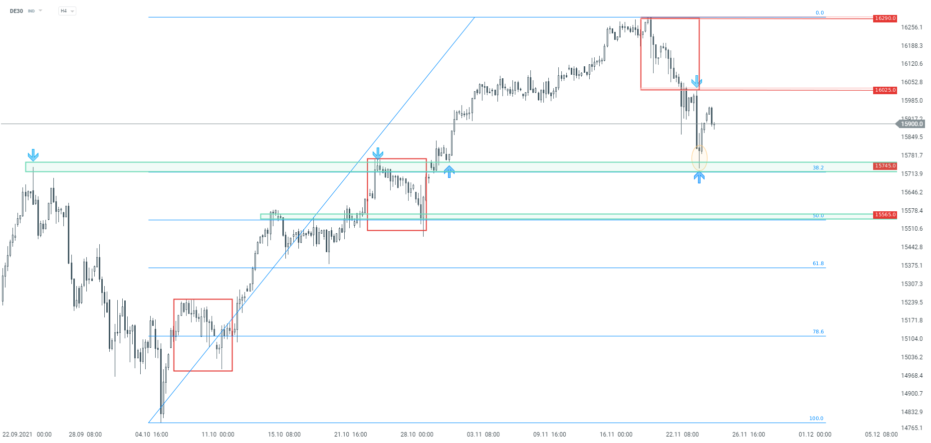 Diamo un'occhiata all'indice tedesco - DAX (DE30). Guardando il grafico H4, si può vedere che l'indice ha avuto la più grande correzione al ribasso durante l'attuale impulso al rialzo. Il prezzo ha superato la struttura 1:1 e, secondo la metodologia Overbalance, suggerisce che la tendenza si sta per invertire. D'altra parte, il movimento al ribasso è stato fermato al supporto chiave a 15.745 punti, che è caratterizzato da precedenti reazioni di prezzo e dal 38,2% del ritracciamento di Fibonacci. La situazione non è del tutto chiara e non è possibile escludere il range trading ai livelli attuali.
