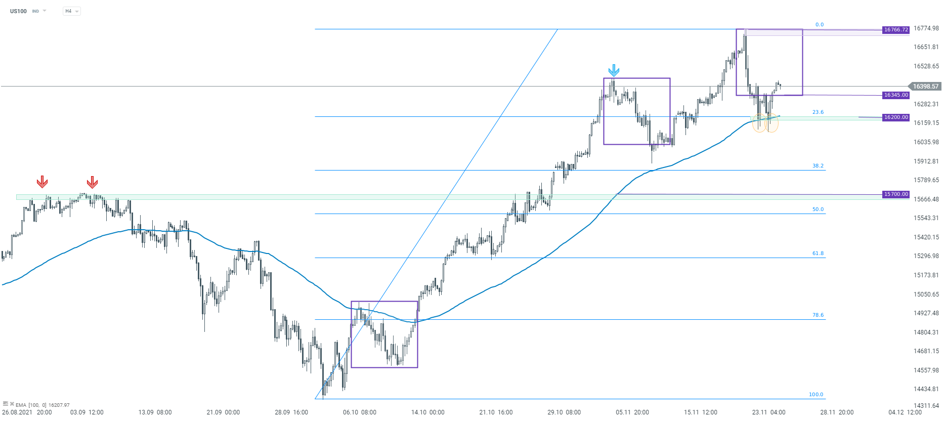 Successivamente, passiamo all'indice tecnologico statunitense - Nasdaq-100 (US100). Guardando il grafico H4, si può vedere che l'indice ha raggiunto nuovi massimi storici. Tuttavia, questa settimana è arrivata una rapida inversione di tendenza. L'attuale correzione al ribasso è la più grande durante il recente impulso al rialzo, ma la continuazione di una tendenza al rialzo sembra essere lo scenario di base. Nonostante l'indice abbia superato il limite inferiore della struttura 1:1, il movimento al ribasso è stato interrotto al successivo supporto chiave vicino a 16.200 punti e il prezzo è tornato sopra la suddetta geometria di mercato. Questo supporto è contrassegnato dalla media mobile a 100 periodi, nonché dal 23,6% del ritracciamento di Fibonacci del recente impulso al rialzo e finché il prezzo rimane al di sopra di esso, sembra che gli acquirenti siano in vantaggio.