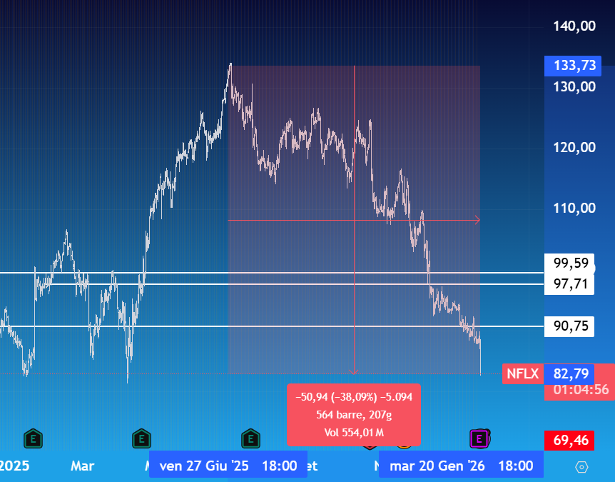 Netflix rilascia i risultati di Q4 2025 con una solida crescita dei numeri e buone prospettive per quanto riguarda il 2026. Il titolo, dopo la trimestrale, perde oltre il -4,5% portandosi in area 83 dollari, consolidando il ribasso di lungo periodo che stiamo vedendo da mesi
