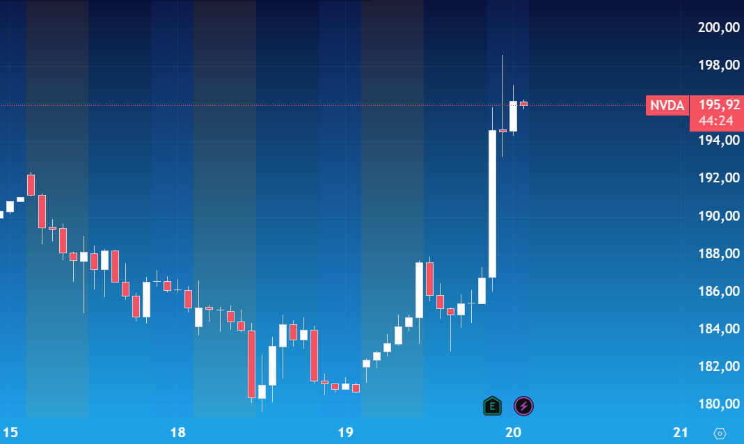 Il rialzo di Nvidia su grafico base 4 ore dopo i risultati della trimestrale di Q3 2025 del 19 novembre - Fonte: TradingView