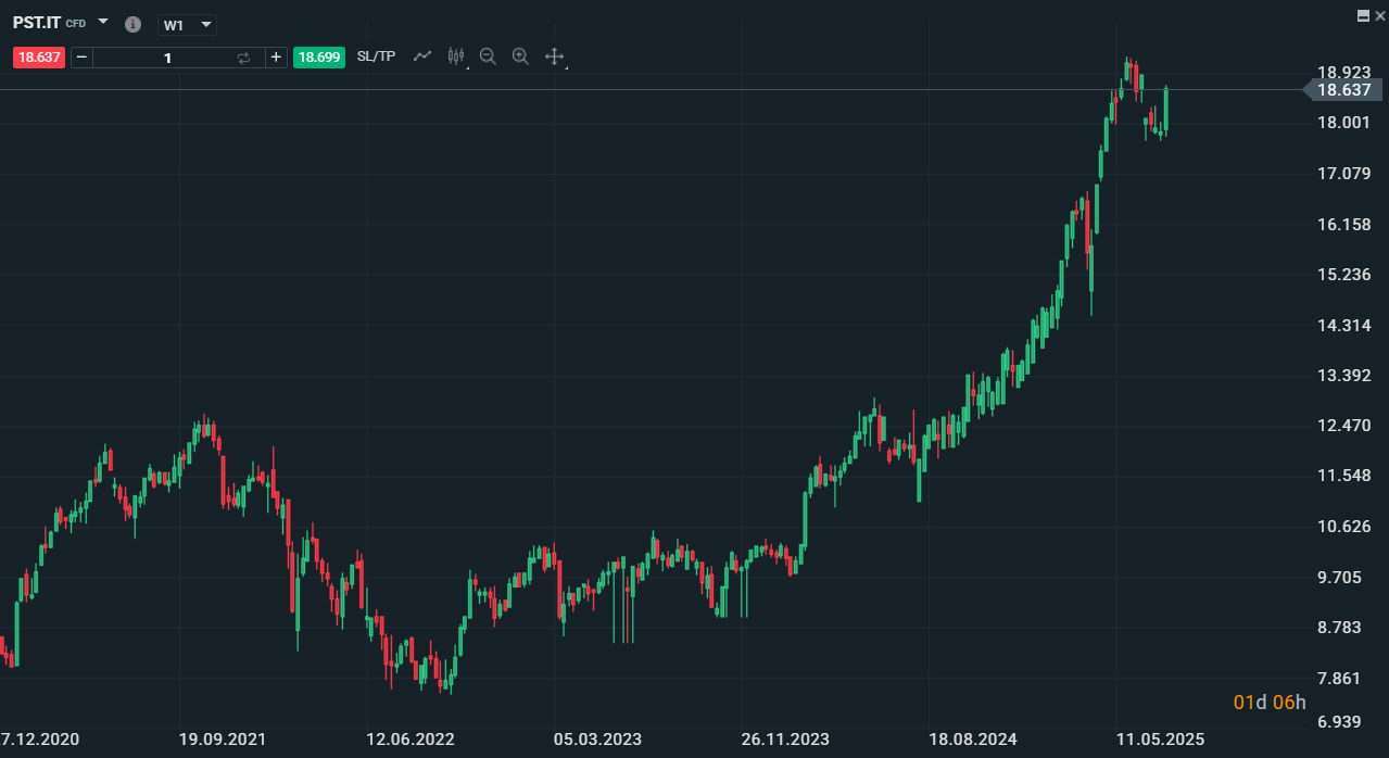 Doppio record con ricavi a 6,5 miliardi di euro per i primi sei mesi del 2025. Risultato operativo a 1,7 miliardi di euro con un +12% anno su anno. La reazione del mercato infatti é molto positiva e il mercato va a segnare nuovi massimi storici per il titolo e la dinamica di lungo periodo rimane assolutamente solida al rialzo. Anche in questo caso nessun segno di cedimento.