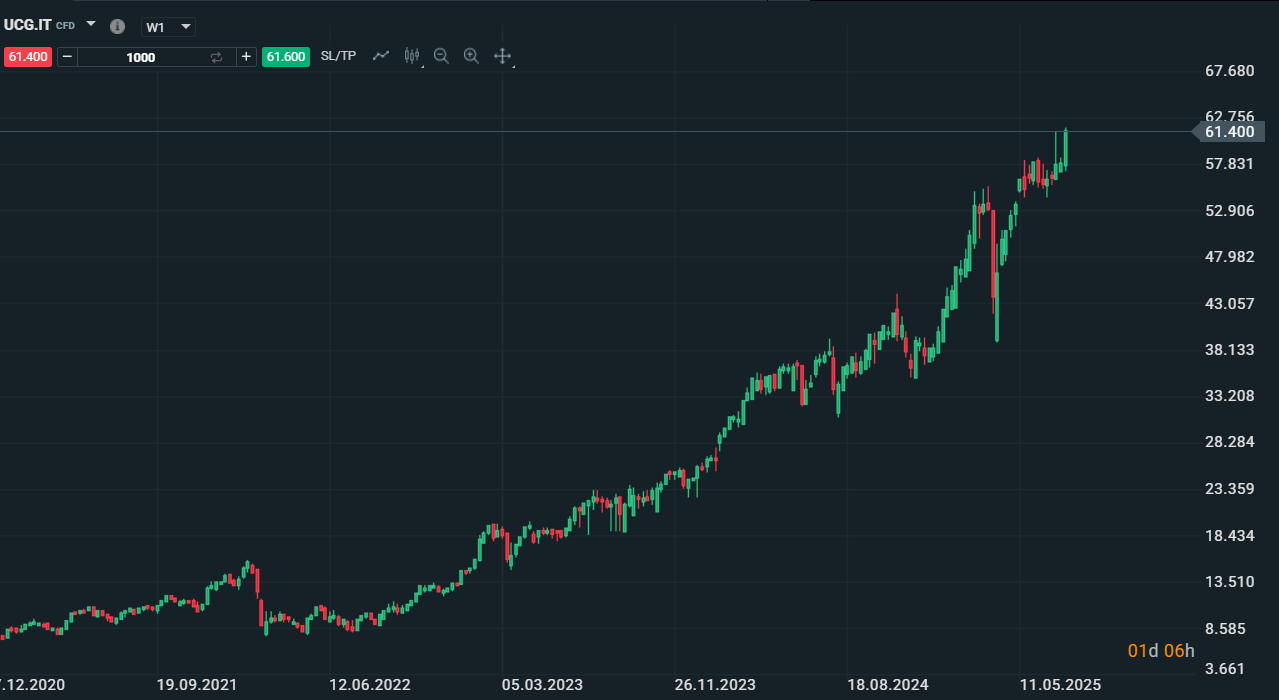 Secondo trimestre con utile netto record a 3,3 miliardi di euro con ricavi a 6,1 miliardi di euro. Guidance che migliora con utile netto atteso a 10,5 miliardi di euro mentre l'utile per azione del primo semestre del 2025 é in crescita del 26%. Dal 2026 si andranno a consolidare i risultati di Commerzbank e Alpha Bank, nel frattempo sulla banca tedesca di tenda di aggredire altro capitale per arrivare ad una quota del 28%. Unicredit presenta un trend assolutamento positivo, la tendenza é palesemente rialzista e non ci sono segnali ribassisti degni di nota. Proprio quest'anno Unicredi arriva a superare i 100 miliardi di capitalizzazione risultando uno dei titoli di punta del Ftse Mib. Il settore bancario va molto bene, non sono in Italia ma anche in Europa con Deutsche Bank che segna anch'essa dei record, questa volta dal 2007.