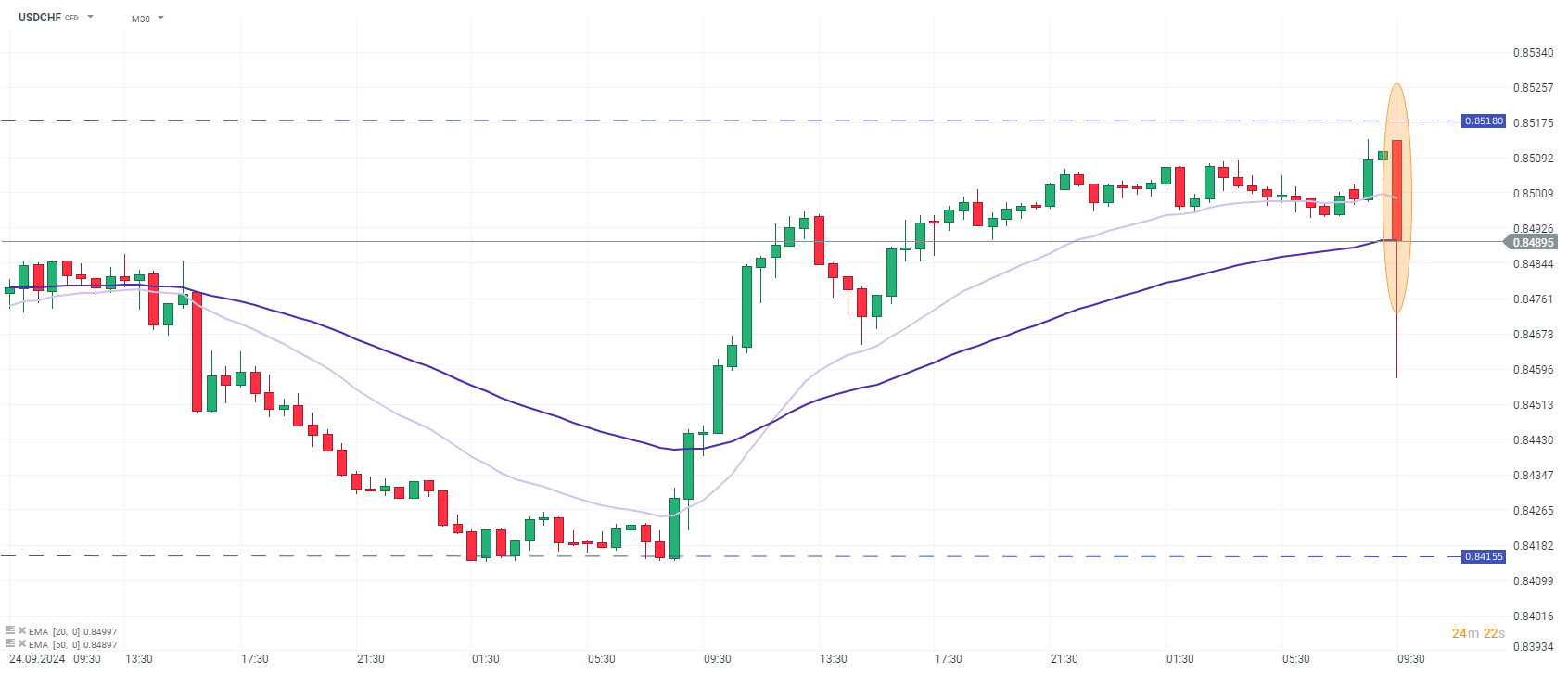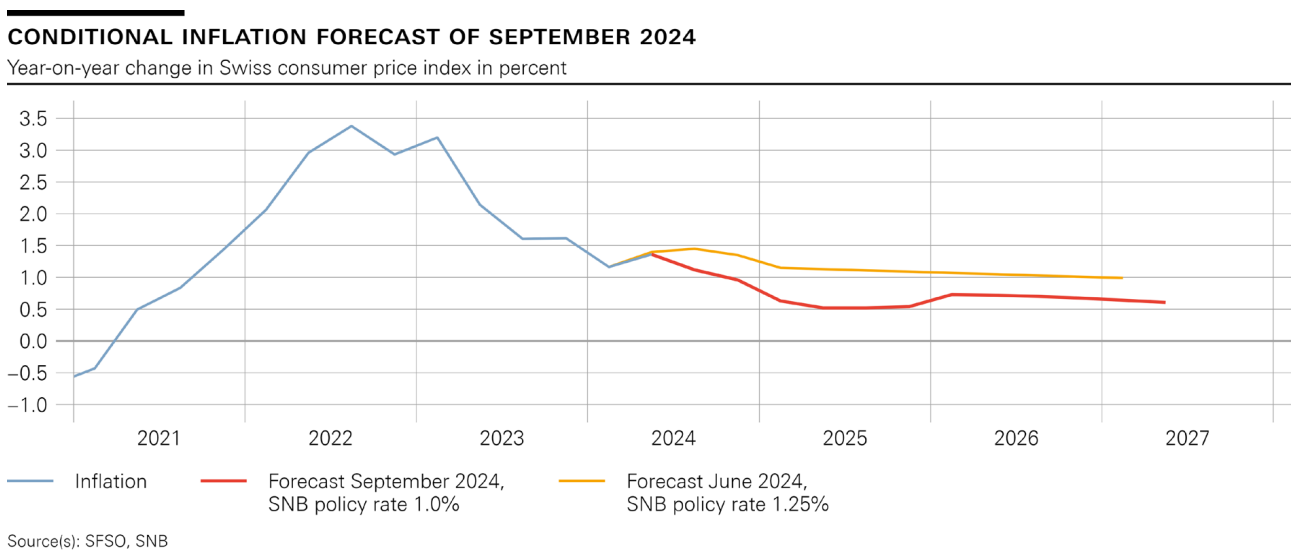 La decisione della SNB è in linea con le previsioni, poiché l'ultima lettura dell'inflazione per la Svizzera è risultata inferiore alle aspettative e l'indice ponderato del franco ha registrato guadagni significativi nell'ultimo mese. Il cambio USDCHF interrompe la sua salita, sperimentando una grande volatilità dopo l'annuncio. La SNB ha anche rivisto al ribasso le previsioni d'inflazione per i prossimi anni, con il CPI svizzero che dovrebbe scendere sotto l'1% entro il primo trimestre del 2025.