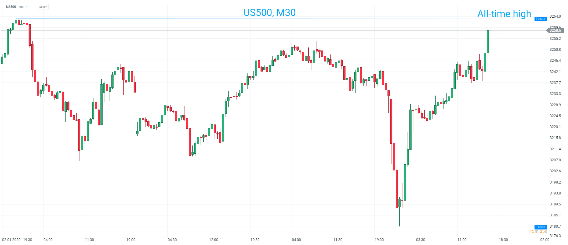 L'US500 ha risposto positivamente al discorso con il mercato che sale al suo massimo della giornata, a circa 80 punti dai minimi, e ora si sta avvicinando a al suo massimo storico di 3263. Fonte: xStation