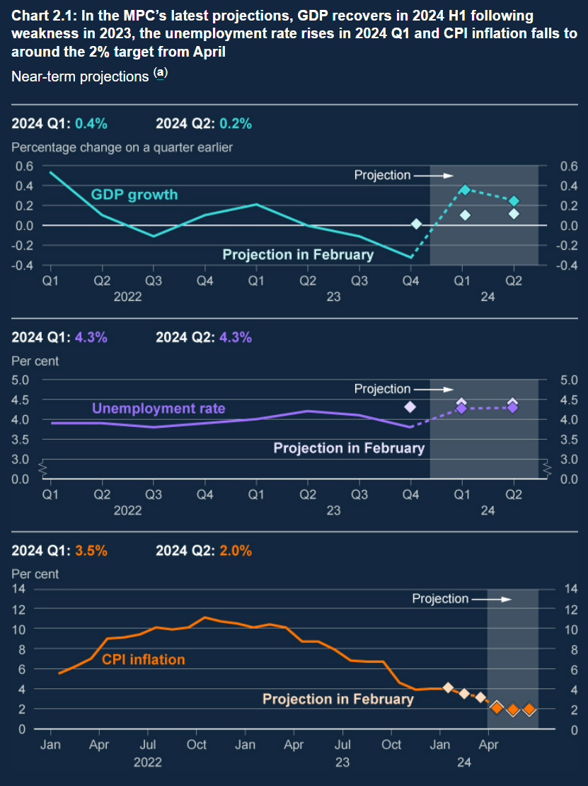 - La BoE stima il PIL +0,4% trimestrale per il primo trimestre del 2024 (previsioni di marzo: +0,1%), prevede un +0,2% trimestrale nel secondo trimestre del 2024
