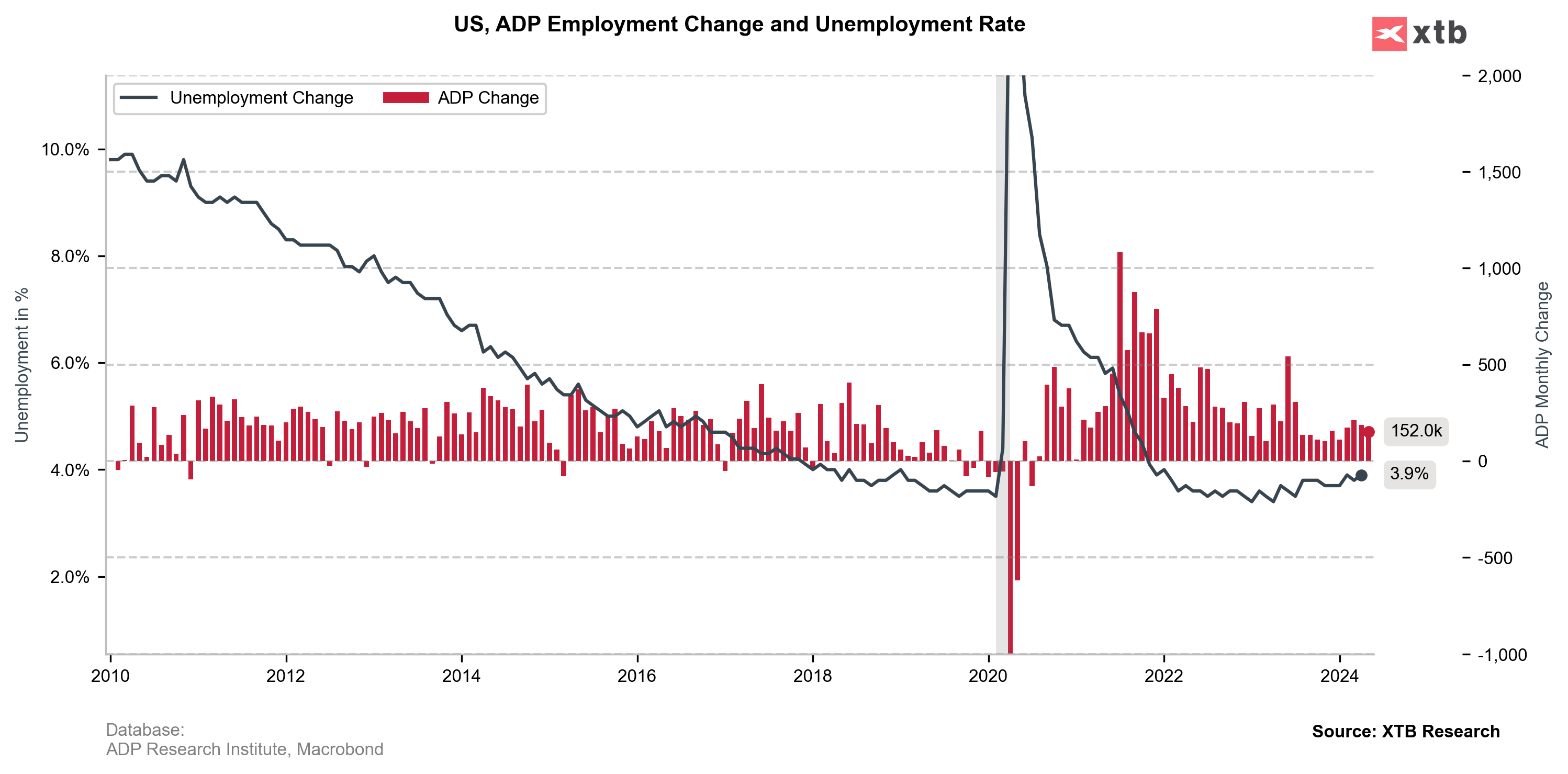 Rapporto ADP statunitense, la variazione occupazionale (maggio) è stata di 152.000 rispetto ai 175.000 previsti. e 192k in precedenza.