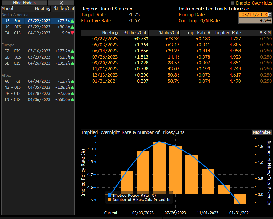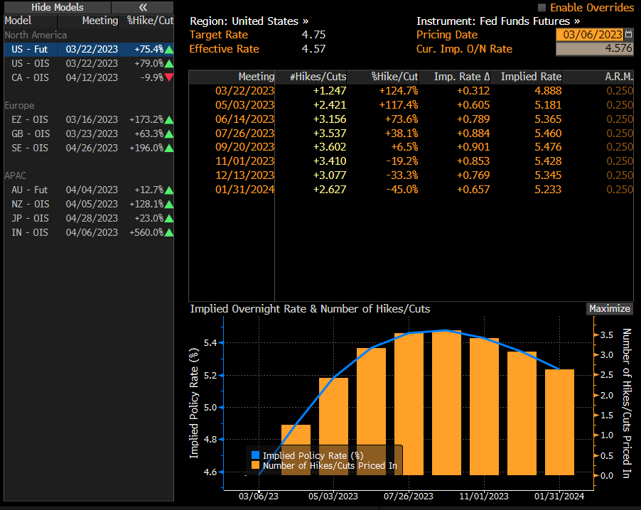 Le aspettative sui tassi di interesse del mercato erano stabili il lunedì precedente (6 marzo 2023) e indicavano un aumento dei tassi almeno fino al 5,75%. Fonte: Bloomberg