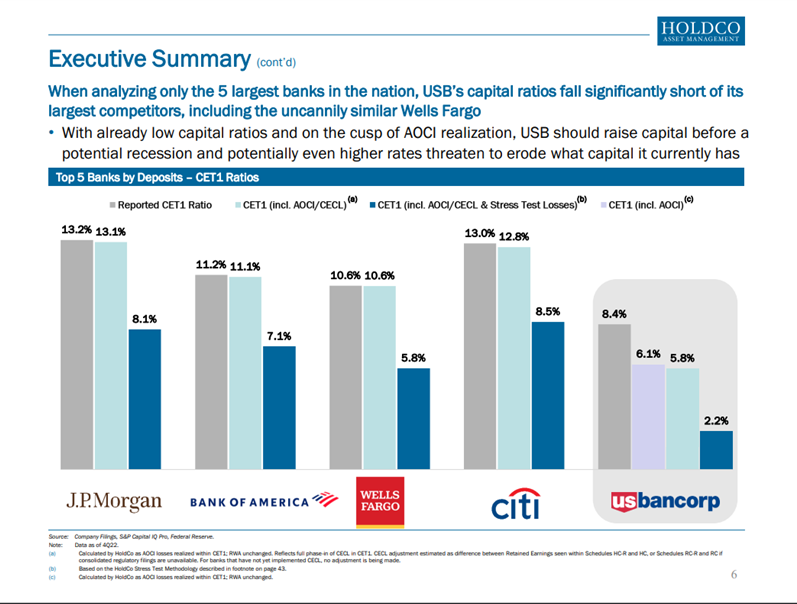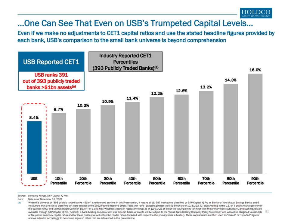 Alla fine del 2022, la banca si è classificata al 391° posto su 393 banche statunitensi con oltre 1 miliardo di dollari di attività, in termini di coefficienti patrimoniali (CET1). Il CET1 (capital-to-asset ratio) è un indicatore in grado di esprimere la capacità di una banca di resistere a diverse tipologie di crisi. Nel primo trimestre 2023, il CET1 è aumentato dall'8,4% all'8,5%. Allo stesso tempo, 4 banche di maggiori dimensioni hanno mantenuto il CET1 a livelli a doppia cifra. Fonte: S&P IQ Pro, US Bancorp, Holdco Asset Management