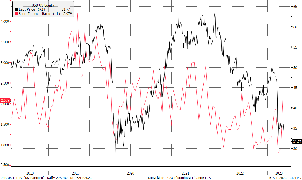 - Il numero di azioni vendute allo scoperto (short interest) è recentemente salito ai livelli visti l'ultima volta nel terzo trimestre del 2022, mostrando un forte aumento degli speculatori che scommettono su uno sconto più profondo e i problemi di US Bancorp.