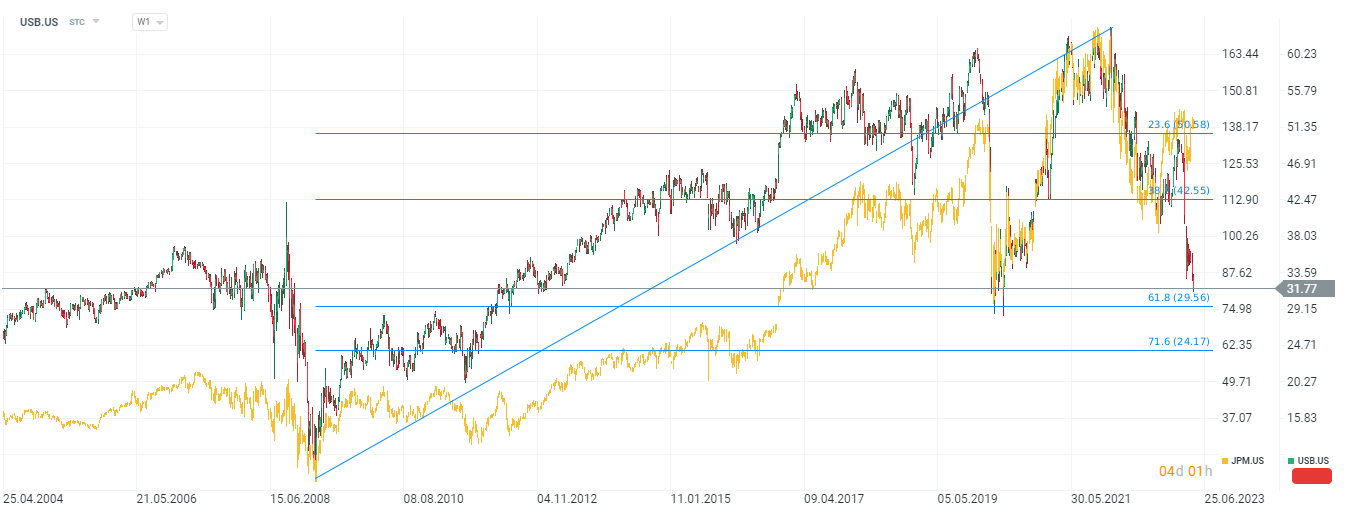 Azioni US Bancorp (USB.US), Grafico W1. Il sentimento rialzista su USB con la crisi bancaria sta andando meno bene rispetto alla più grande negli Stati Uniti, JP Morgan (JPM.US, grafico giallo) e altre grandi banche. Il prossimo livello importante secondo Fibonacci potrebbe essere il livello vicino a $ 30, dove vediamo il 61,8% del ritracciamento di Fibonacci dell'ondata al rialzo del 2008. Fonte: xStation5