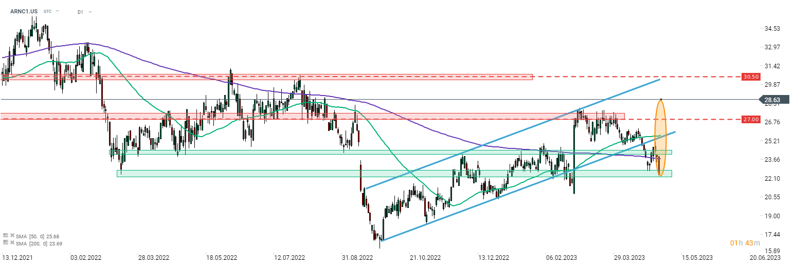Arconic (ARNC1.US) è in ripresa dopo che WSJ ha lasciato intendere che la società potrebbe essere acquisita da Apollo Global Management a $ 30 per azione. Il titolo ha iniziato la sessione odierna con un grande gap di prezzo rialzista e sta tornando all'interno di un range del canale al rialzo. Una zona di resistenza a breve termine da tenere d'occhio si trova vicino al limite superiore del canale nell'area dei 30,50$. Fonte: xStation5