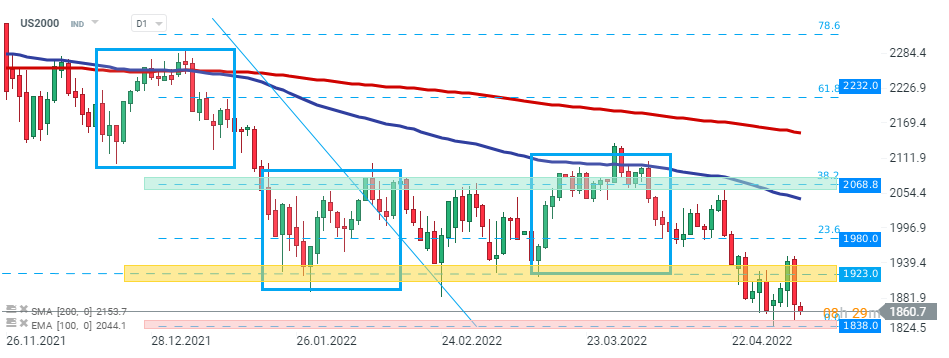 US2000 continua a scendere e sta attualmente testando i minimi recenti a 1838 punti. Se dovesse continuare il movimento al ribasso, il movimento potrebbe accelerare verso i massimi pre-pandemici a 1717 punti. Fonte: xStation5