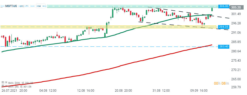 Il titolo Microsoft (MSFT.US) ha iniziato la sessione di oggi in rialzo e ha superato il limite inferiore della formazione del cuneo e 50 SMA (linea verde). Attualmente il prezzo delle azioni si sta avvicinando al massimo storico a $ 306,00. Fonte: xStation5