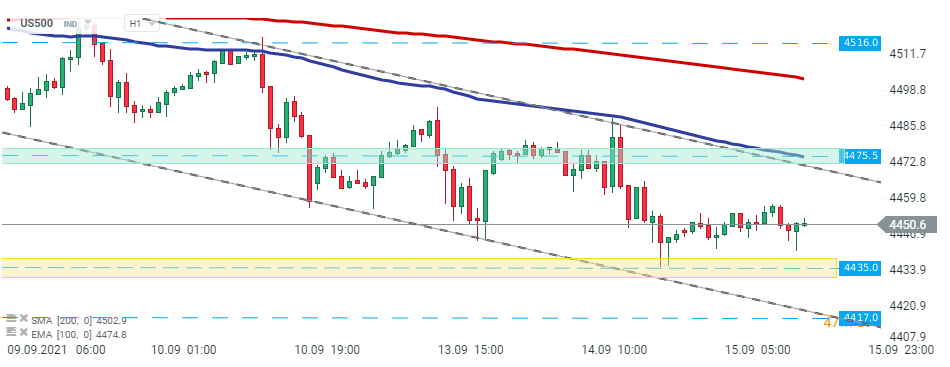 US500 si è trovato di recente in un canale locale al ribasso, tuttavia il calo è stato fermato attorno al supporto locale a 4435 punti. Finché il prezzo rimane al di sopra, potrebbe essere lanciato un altro movimento al rialzo verso la resistenza a 4475,5 punti. Questo livello è ulteriormente rafforzato dal limite superiore del canale e dall'EMA 100 (linea viola). D'altra parte, un movimento oltre il suddetto supporto potrebbe aprire la strada verso il limite di 4417,00 punti. Fonte; xStation5