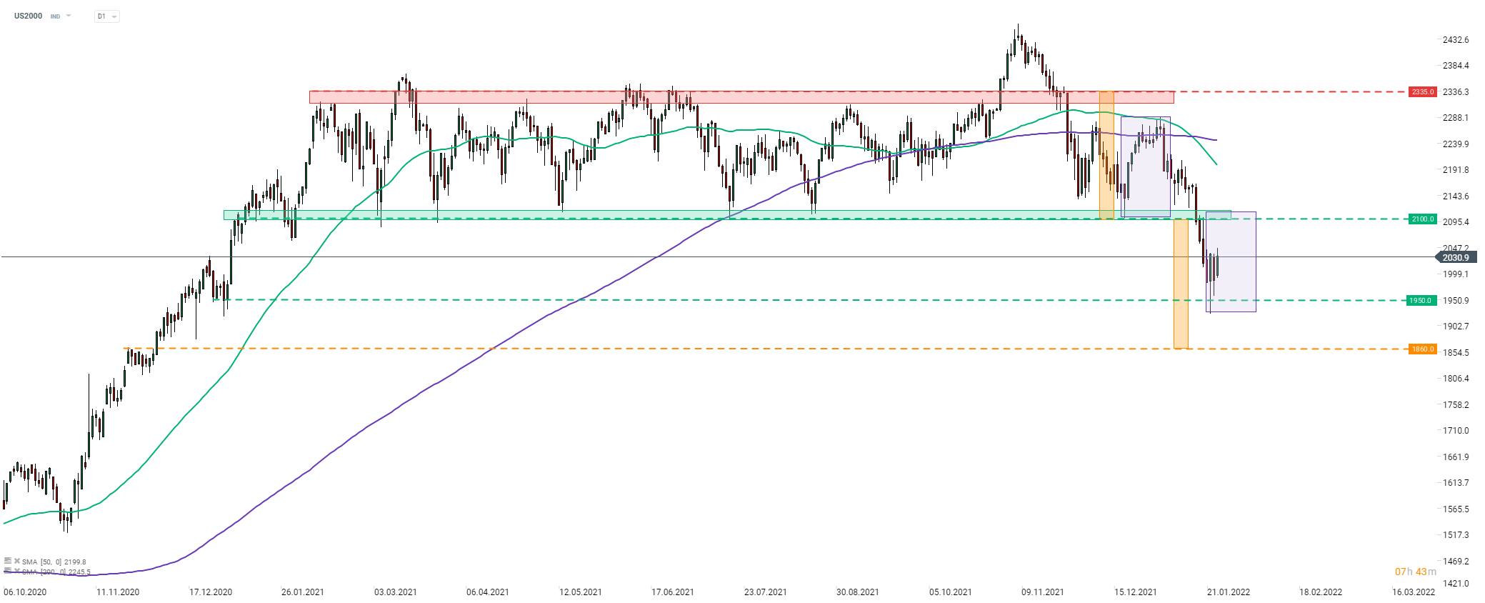 La scorsa settimana Russell 2000 (US2000) ha superato il limite inferiore del range di trading di 2.100-2.335 punti. Il calo è stato fermato nell'area di 1.950 punti e l'indice ha iniziato a riprendersi insieme ad altri importanti indici di Wall Street. Il primo grande test per il movimento al rialzo arriverà a 2.100 punti, il limite inferiore del range di trading superato in precedenza. Superare questo ostacolo significherebbe anche superare la geometria del mercato locale, segnalando così un potenziale cambiamento nella tendenza a breve termine.