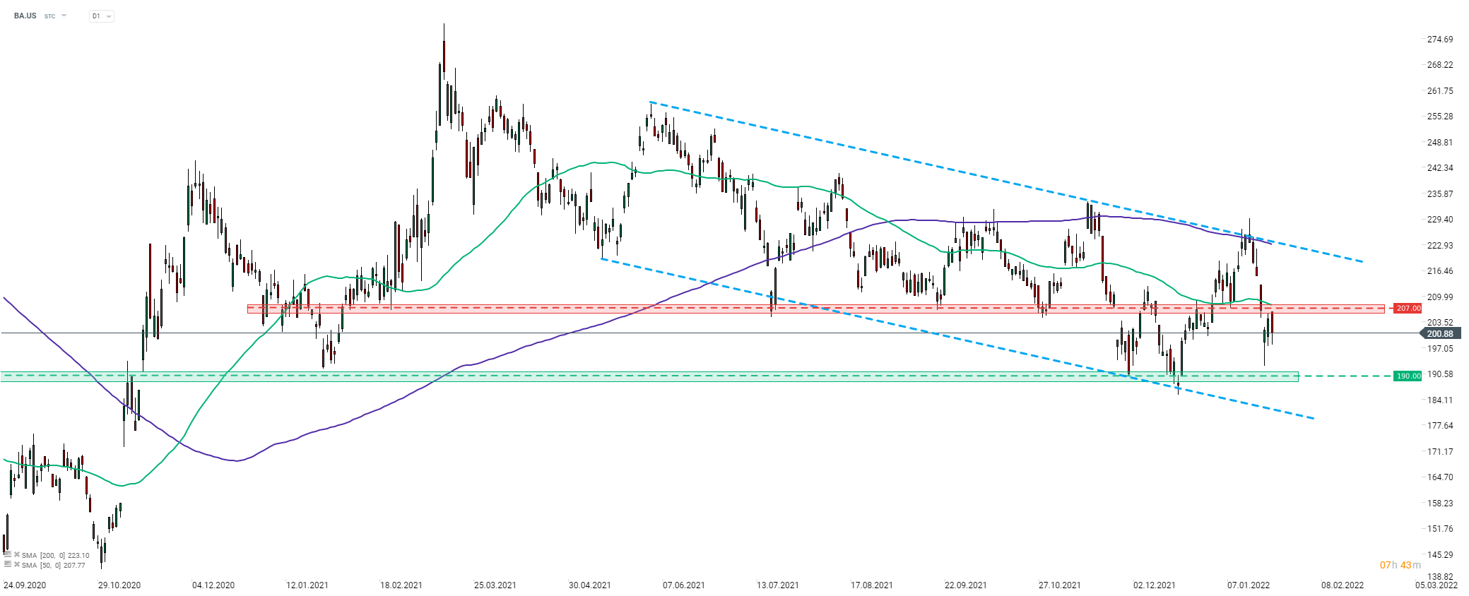 Nonostante abbia riportato una grande perdita, Boeing (BA.US) ha iniziato la sessione odierna di Wall Street al rialzo. Il titolo ha testato la zona di resistenza di $ 207,00 ma non è riuscito a superarla. Il prezzo si sta ritirando e sta tornando sotto la soglia di $ 200,00 al momento della stampa. La zona di supporto più vicina da tenere d'occhio si trova intorno a $ 190,00. Fonte: xStation5