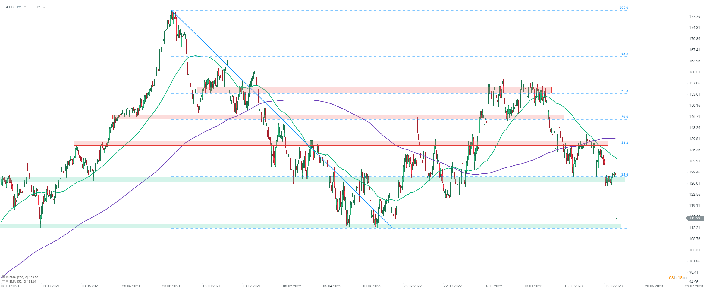Il prezzo delle azioni di Agilent (A.US) è sceso oggi, dopo la pubblicazione degli utili. Il titolo è sceso al livello più basso da luglio 2022 e ha testato la zona di supporto contrassegnata dai minimi di metà 2022. Fonte: xStation5