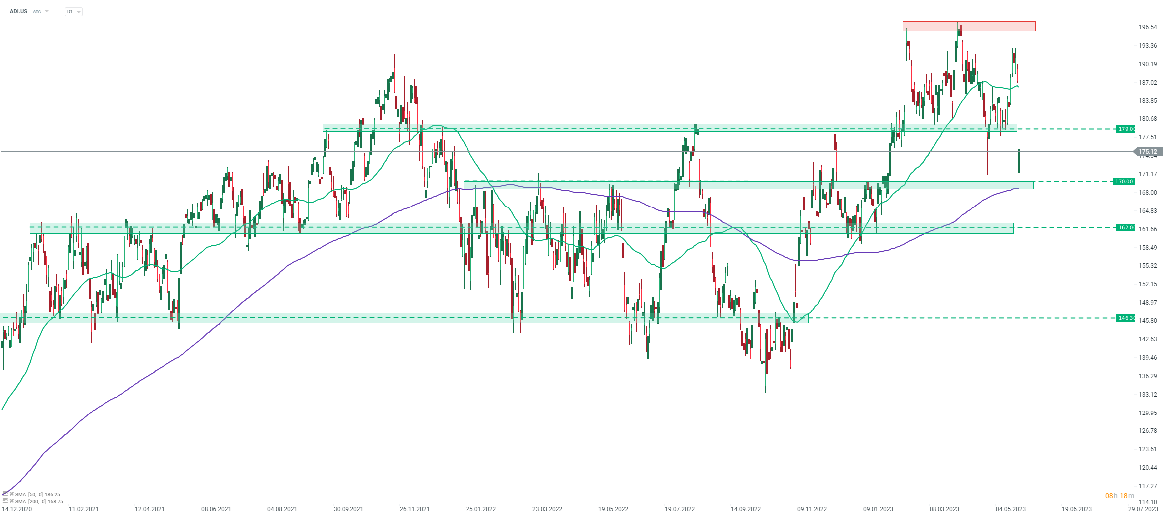 Analog Devices (ADI.US) ha iniziato il cash trading di oggi con un grande gap di prezzo ribassista, scendendo sotto la zona di supporto di $ 179,00. Il calo è stato interrotto nella zona di supporto compresa tra $ 170 e la media mobile di 200 sessioni (linea viola) e il titolo ha iniziato a riprendersi in seguito. Fonte: xStation5
