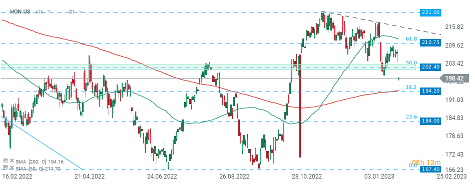 Il titolo Honeywell (HON.US) ha iniziato la sessione odierna con un gap di prezzo ribassista e ha superato il supporto principale a $ 202,40, che coincide con il 50,0% del ritracciamento di Fibonacci dell'ondata al ribasso iniziata nell'agosto 2021. Se prevale il sentimento attuale, il movimento al ribasso potrebbe essere esteso verso un altro supporto a $ 194,20. Fonte: xStation5