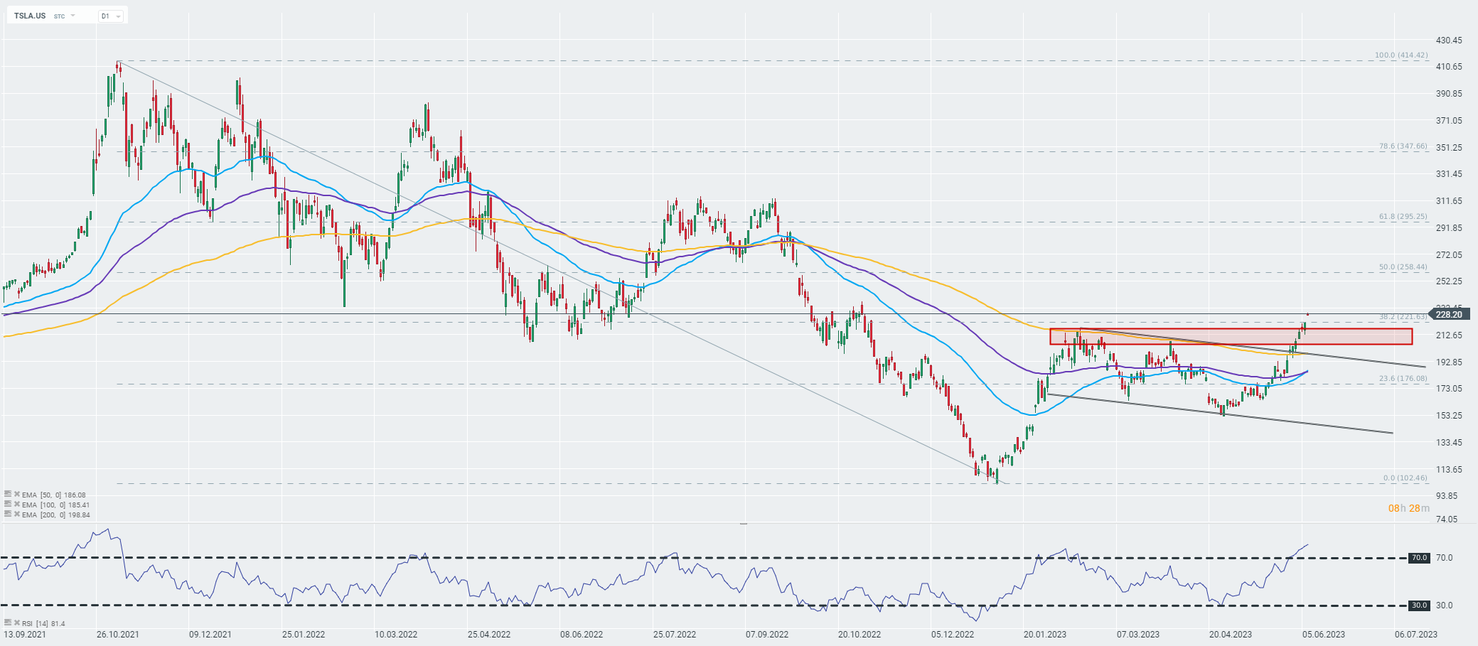 Le azioni Tesla iniziano la sessione odierna con un gap al rialzo che supera la zona di resistenza segnata sul grafico. Fonte: xStation 5