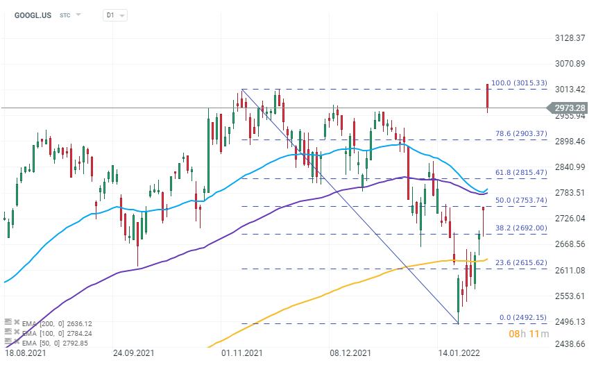 Come previsto, le azioni di Alphabet hanno iniziato la sessione odierna con un gigantesco gap al rialzo, il cui range è salito al di sopra dei massimi storici. Attualmente è in corso un movimento di ripresa che potrebbe riportare la società oltre la sua capitalizzazione di mercato di $ 2 trilioni. Fonte: xStation 5