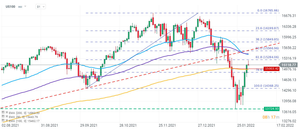 Grafico US100, D1. L'indice delle società tecnologiche è riuscito a superare la media mobile esponenziale a 200 periodi (linea aurea) e ora sta tentando di superare la barriera formata dal 50% del ritracciamento di Fibo. Il supporto più vicino rimane l'area vicino ai 15.000 punti, rafforzata dal 61,8% del ritracciamento e dalla già citata media mobile esponenziale. Fonte: xStation 5