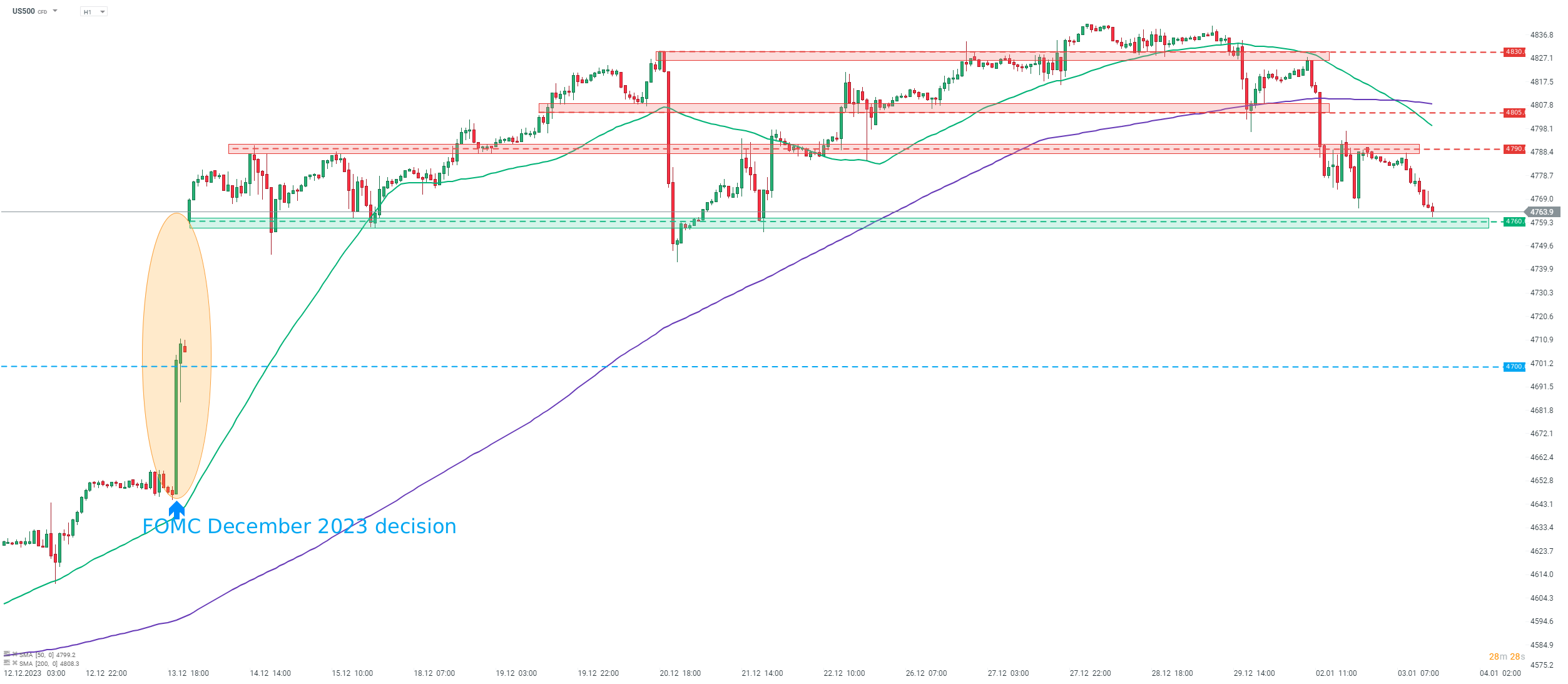 I futures S&P 500 (US500), così come altri indici statunitensi, sono in ribasso oggi. Questo pomeriggio l'indice US500 è sceso sotto i minimi di ieri e viene scambiato al livello più basso dal 21 dicembre 2023. Al momento, l'indice sta testando la zona di supporto di 4.760 punti. Un movimento oltre potrebbe portare ad una chiusura del gap rialzista che si è verificato dopo la decisione sul tasso del FOMC di dicembre 2023. La prima zona di supporto da tenere d'occhio si trova nell'area dei 4.700 punti, che ha visto alcune reazioni dei prezzi nel periodo novembre 2021 - gennaio 2022.