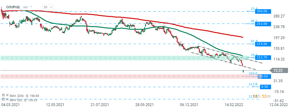 Il titolo Coupa Software (COUP.US) è ha iniziato la sessione odierna con un enorme gap di prezzo ribassista e potrebbe attualmente dirigersi verso un supporto importante a $ 50,00, dove si trovano i minimi di gennaio 2019. Fonte: xStation5