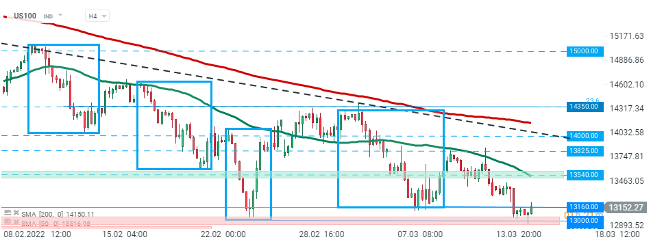 Ieri l'US100 ha subito un duro colpo, tuttavia è riuscito a fermare il calo attorno al supporto principale a 13000 punti e oggi possiamo osservare un aumento dell'attività degli acquirenti. L'indice sta attualmente testando la resistenza locale a 13160 punti. Se venisse superata, il prossimo livello da tenere d'occhio si trova a 13540 punti. Fonte: xStation5