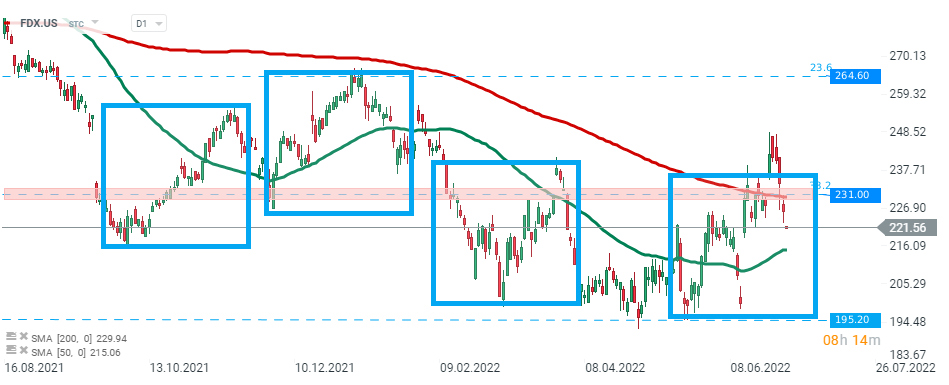 Il prezzo delle azioni FedEx (FDX.US) è riuscito a superare il limite superiore della struttura 1:1 all'inizio della settimana, tuttavia il rialzo si è rivelato di breve durata. Il prezzo si è ritirato ed è attualmente scambiato al di sotto della resistenza locale a $ 231,00, che coincide con il 38,2% del ritracciamento di Fibonacci dell'ondata al rialzo iniziata a marzo 2020. Se prevale il sentimento attuale, il prossimo livello da tenere d'occhio potrebbe trovarsi a $ 195,20. Fonte: xStation5