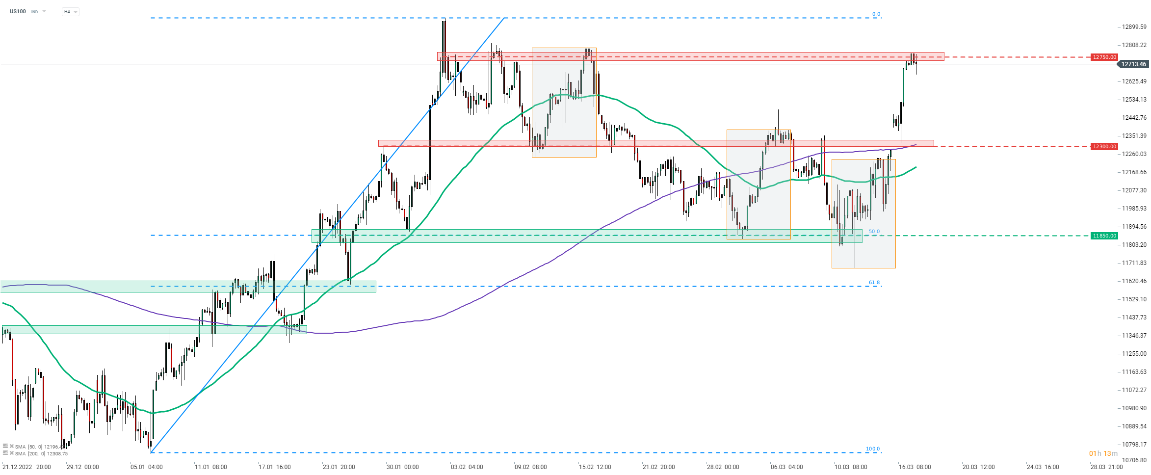 Questa settimana il Nasdaq-100 (US100) ha sovraperformato altri importanti indici di Wall Street, grazie a una quota quasi inesistente di banche nell'indice. Il benchmark ad alto contenuto tecnologico è in rialzo di quasi il 9% dal minimo giornaliero di lunedì. Mentre l'indice è riuscito a superare il limite superiore della geometria del mercato e il precedente massimo locale, invalidando così la struttura di tendenza al ribasso, ha trovato una zona di resistenza nell'area dei 12.750 punti. Il primo tentativo di superamento è fallito ma l'indice rimane vicino.