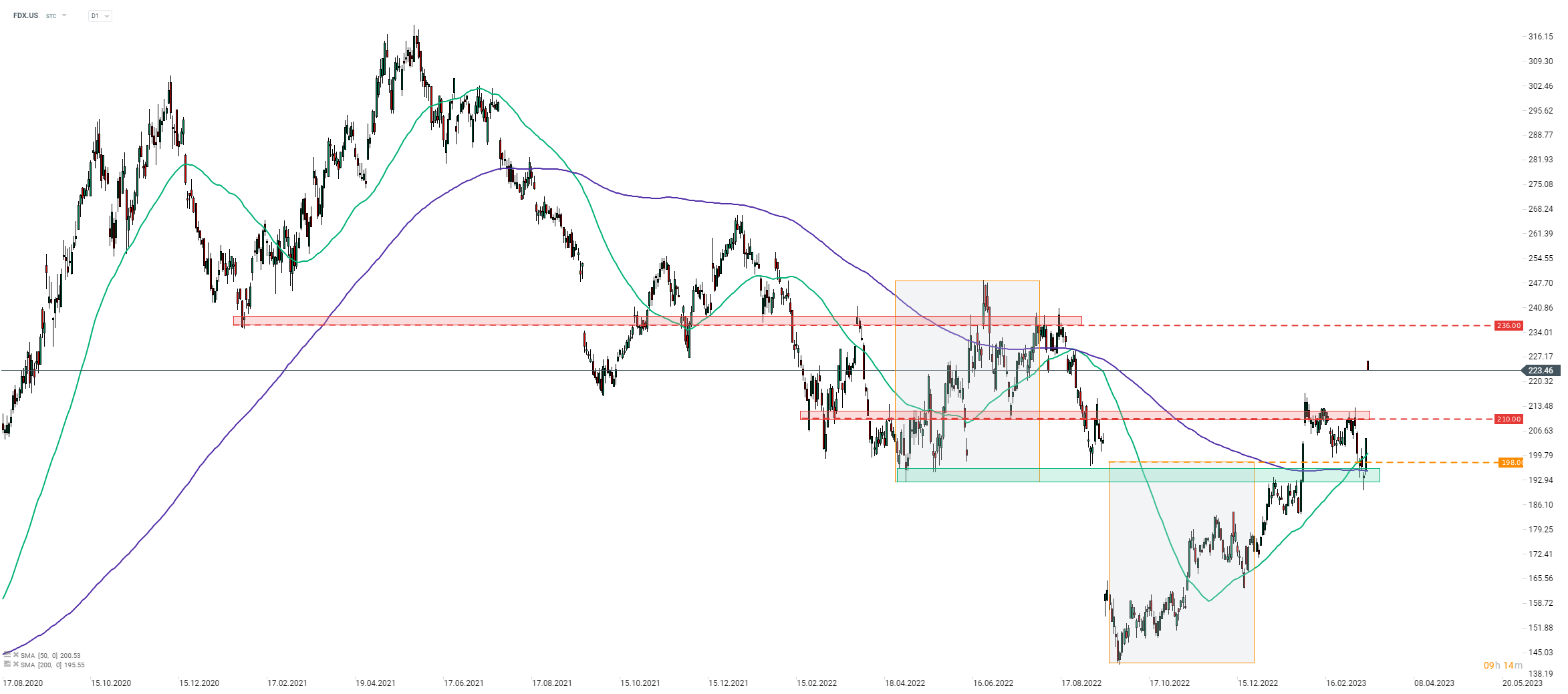 FedEx (FDX.US) ha iniziato la sessione odierna con un grande gap di prezzo rialzista, grazie all'aggiornamento della guida. Il titolo ha superato la zona di resistenza di $ 210,00 e un precedente massimo locale nell'area di $ 217. La prossima zona di resistenza da tenere d'occhio si trova al di sopra della soglia dei 236,00$. Fonte: xStation5