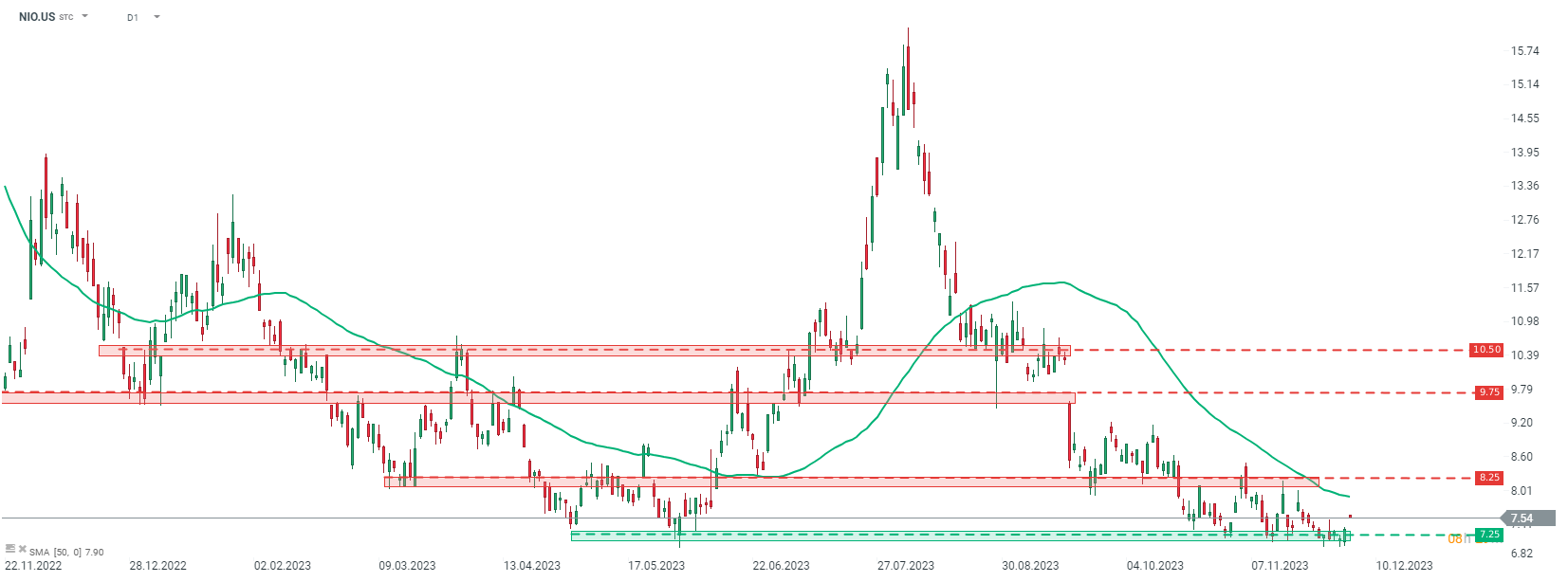 NIO (NIO.US) è in rialzo nonostante la pubblicazione degli utili piuttosto deludenti. Il prezzo delle azioni sta rimbalzando dalla zona di supporto di 7,25 dollari, che recentemente non è riuscito a superare alcune volte. La zona di resistenza a breve termine da tenere d’occhio si trova al di sotto della soglia degli 8,25 dollari ed è contrassegnata dalle precedenti reazioni dei prezzi. Fonte: xStation5