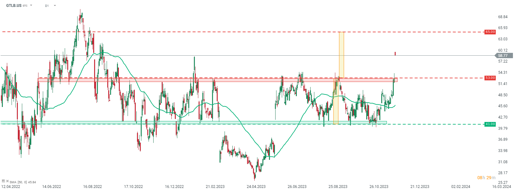 Le azioni di GitLab (GTLB.US) sono in rialzo oggi in seguito alla pubblicazione di un solido rapporto sugli utili fiscali del terzo trimestre. Le azioni hanno superato la zona di resistenza di $ 53,00, che fungeva da limite superiore del trading range, all'inizio della sessione di oggi. La resistenza a breve termine da tenere d’occhio è l’area di 65,00$, dove si può trovare il potenziale target di un breakout dal trading range. Fonte: xStation5