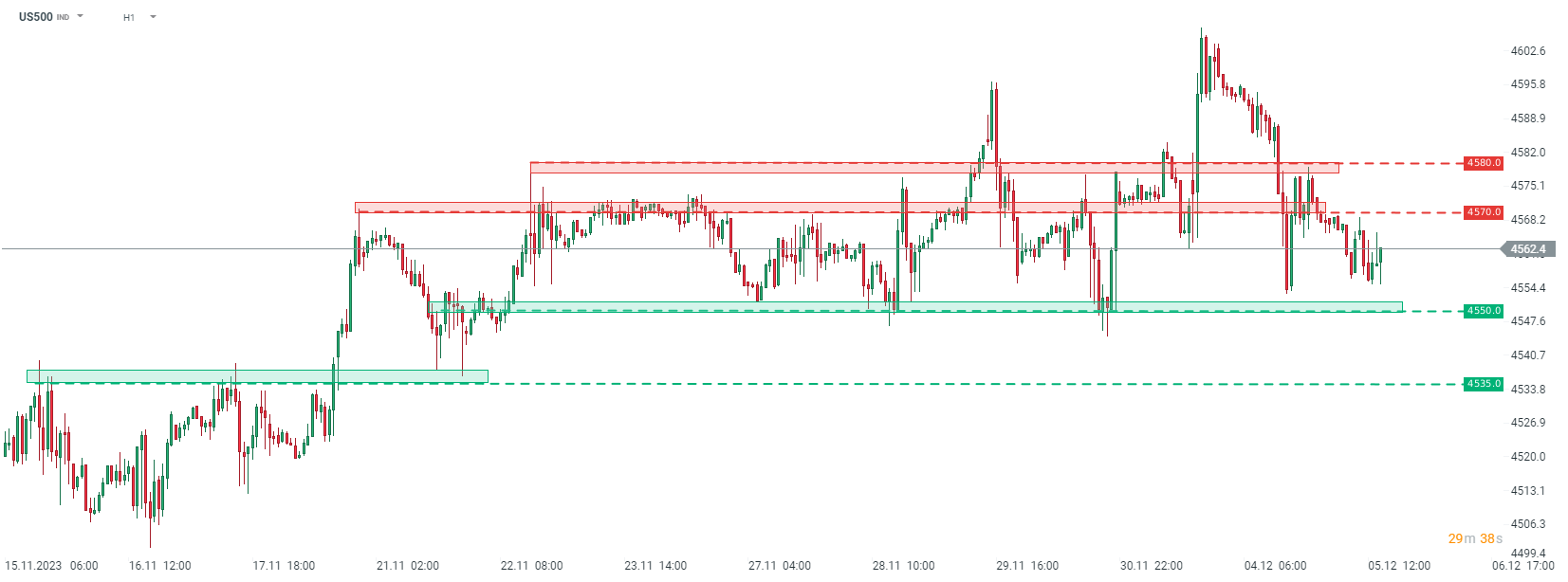 Dando un'occhiata ai futures S&P 500 (US500) sul grafico intraday (H1), possiamo vedere che l'indice è stato scambiato recentemente con un movimento laterale. Nelle ultime due settimane i movimenti dei prezzi sull’indice sono stati per lo più limitati al range 4.535-4.580 punti. Il pullback di ieri non è riuscito a raggiungere il supporto di 4.550 punti e l'indice ha recuperato parte del calo in seguito. Tuttavia, oggi si può osservare una nuova ondata di vendite con l'indice US500 che si avvicina pericolosamente ai minimi giornalieri di ieri. Un movimento sotto la suddetta area di 4.550 punti aprirebbe la strada a un test del limite inferiore del trading range a 4.535 punti.