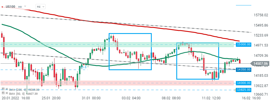 Ieri l'US100 è salito bruscamente, tuttavia non è riuscito a superare la 50 SMA (linea verde) e l'indice si è ritirato. Se prevale il sentimento attuale, è possibile ripetere il test del supporto locale intorno a 14350 punti. D'altra parte, se la situazione dovesse cambiare, il movimento al rialzo potrebbe accelerare verso la resistenza psicologica a 15000 punti, che è contrassegnata dal limite superiore della struttura 1:1. Fonte: xStation5