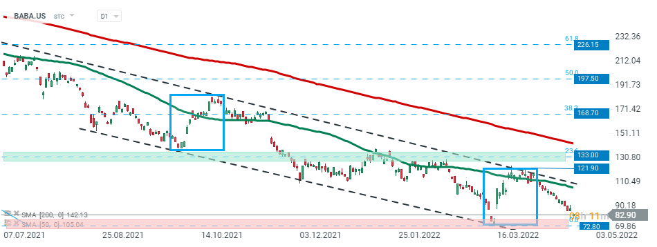 Alibaba (BABA.US) si muove in un trend ribassista da novembre 2020. All'inizio di aprile. Il prezzo ha testato un'importante resistenza intorno a 121,90$, che coincide con il limite superiore del canale discendente e il limite superiore della struttura 1:1. Tuttavia, il momentum rialzista è svanito rapidamente la situazione sembra essere cambiata. Il titolo ha iniziato la sessione odierna in ribasso e, se prevale il sentimento attuale, il movimento al ribasso potrebbe accelerare verso il supporto principale a 72,80 dollari, dove si trovano i minimi di marzo. Fonte: xStation5