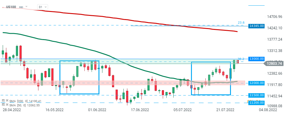 L'US100 sta attualmente testando la resistenza chiave a 13000 punti, che è contrassegnata dal limite superiore della struttura locale 1:1 e dal ritracciamento di Fibonacci del 38,2% dell'onda ascendente lanciata a marzo 2020. In caso di rottura al rialzo, il movimento al rialzo potrebbe accelerare ulteriormente. Tuttavia, se i venditori riescono a riprendere il controllo, potrebbe essere lanciato un altro impulso al ribasso verso il supporto a 12000 punti. Fonte: xStation5