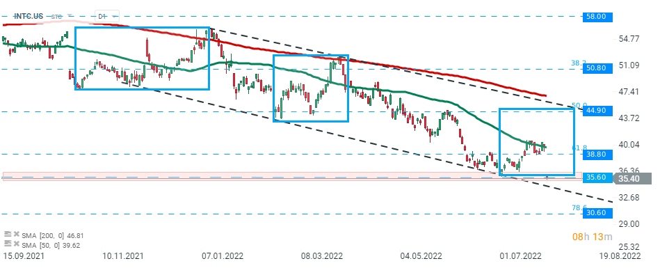 Il titolo Intel (INTC.US) ha aperto la sessione odierna con un gap di prezzo ribassista e sta attualmente testando il supporto a 38,80$, segnato dai minimi recenti e dal limite inferiore del canale discendente. Se dovesse verificarsi una rottura al ribasso, il prossimo obiettivo per i venditori si trova a $ 30,60, che coincide con il ritracciamento di Fibonacci del 78,6% dell'onda al rialzo lanciata nel 2013. Fonte: xStation5