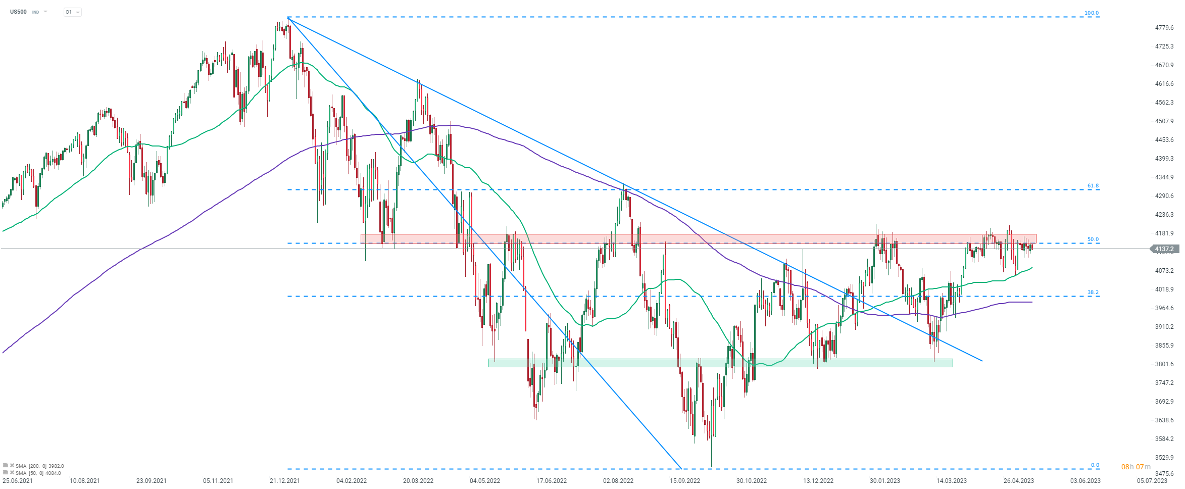 Nonostante i dati macro statunitensi di aprile, i futures S&P 500 (US500) sono leggermente in ribasso oggi. L'indice continua ad aggirarsi vicino alla zona di resistenza di 4.150 punti, contrassegnata da precedenti reazioni di prezzo e 50% del ritracciamento della mossa al ribasso iniziata all'inizio del 2022. Da un lato, i ripetuti tentativi di superare la zona di 4.150 punti mostrano che l'impulso rialzista manca di forza. D'altra parte, ogni mancato superamento di 4.150 punti ha provocato un pullback piuttosto superficiale, suggerendo che i ribassisti non sono allo stesso modo in grado di assumere il controllo. Detto questo, potremmo aver bisogno di un catalizzatore per innescare un'altra grande mossa. Il mancato raggiungimento di un accordo sul tetto del debito USA potrebbe essere uno di questi catalizzatori.