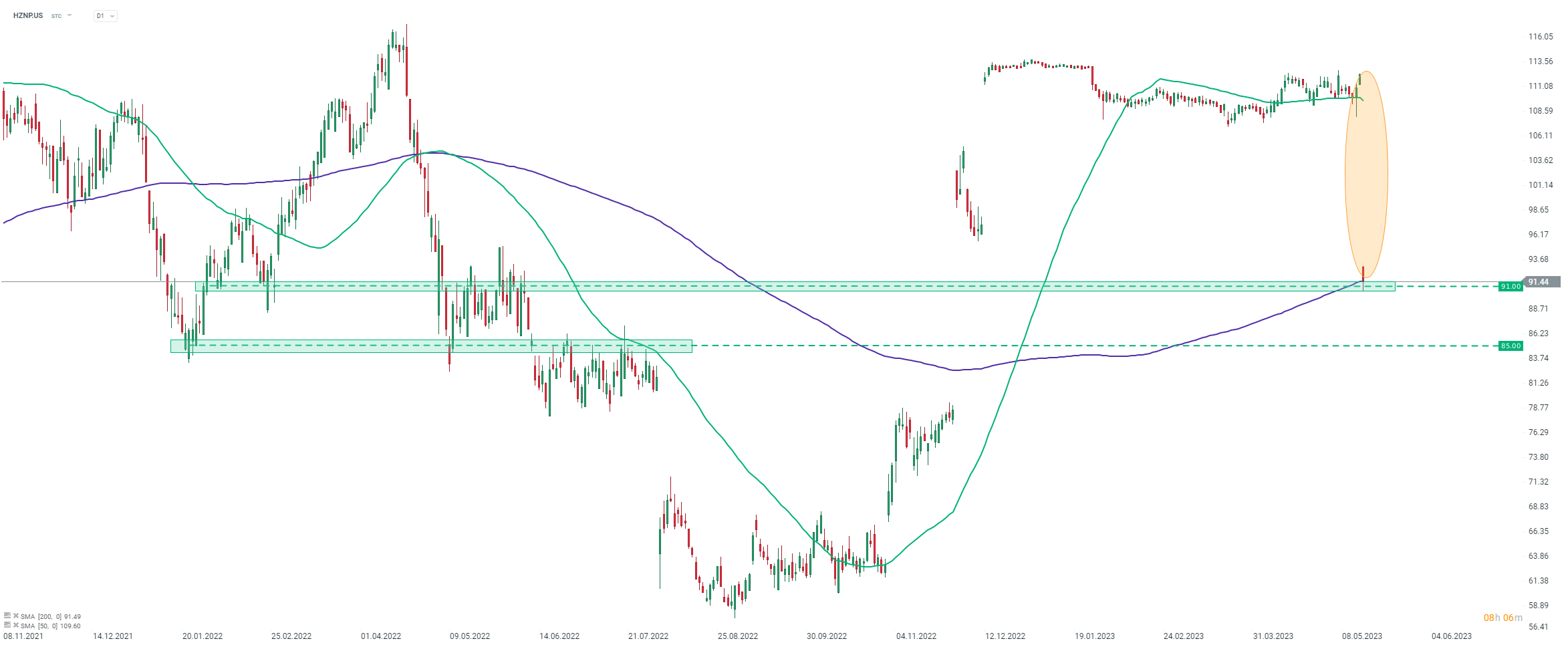 Horizon Therapeutics (HZNP.US) è in calo dopo i rapporti secondo cui FTC potrebbe bloccare l'accordo con Amgen (AMGN.US). Le azioni sono in calo di quasi il 20% ed è oggi uno dei titoli di Wall Street con le peggiori performance. Il prezzo sta attualmente tentando di fermare il calo nella zona di supporto di $ 91,00, contrassegnata dalla media mobile di 200 sessioni (linea viola). Fonte: xStation5