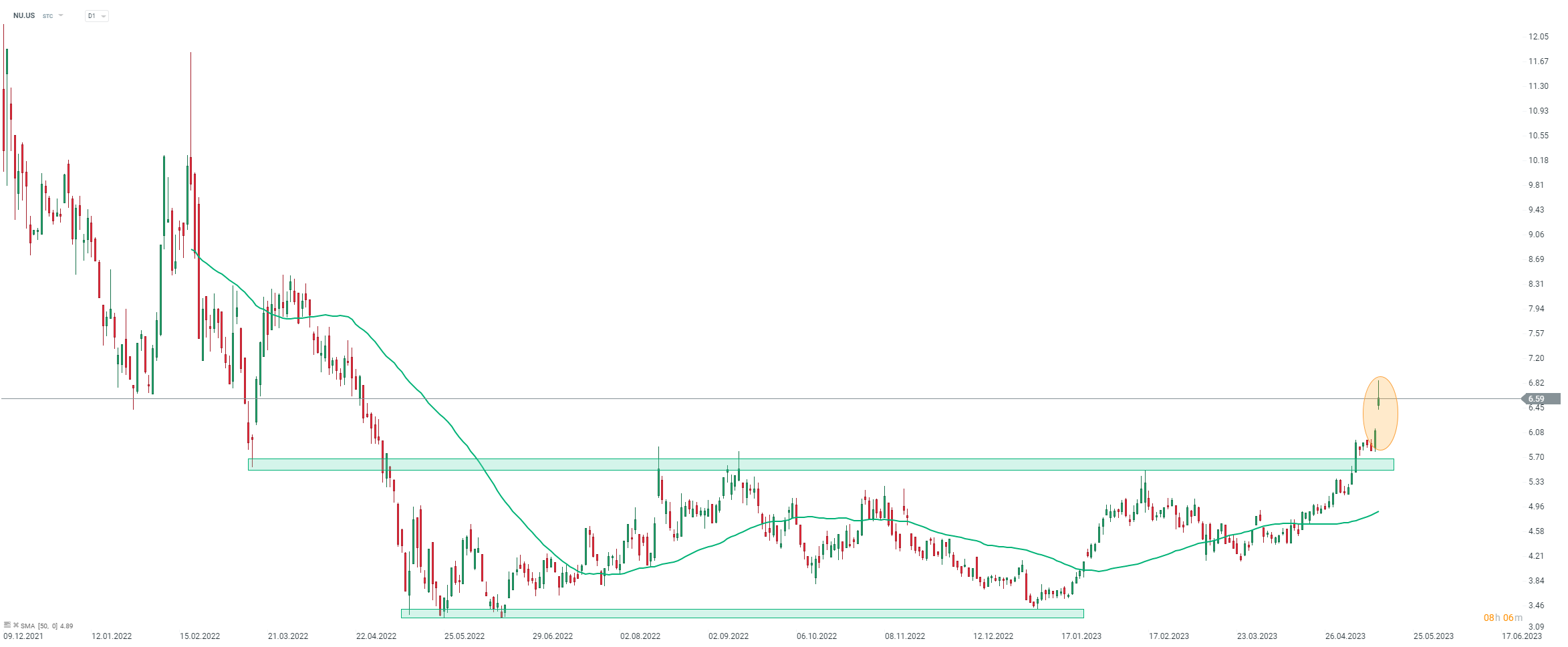 Nu Holdings (NU.US) ha raggiunto nuovi massimi di 1 anno dopo la pubblicazione del solido rapporto sugli utili del primo trimestre 2023. Sebbene il titolo abbia già invertito parte del movimento, è comunque in rialzo di quasi l'8% nel corso della giornata. Fonte: xStation5