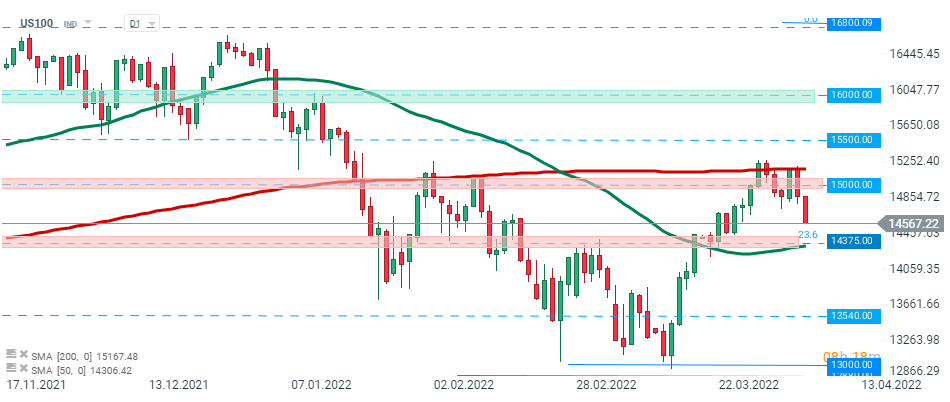 L'US100 si è ritirato bruscamente dopo che non è riuscito a superare la resistenza a 15000 punti, che coincide con la 200 SMA (linea rossa). Se prevale il sentiment attuale, il supporto a 14375 punti potrebbe essere a rischio. Se venisse superato, la correzione al ribasso potrebbe intensificarsi verso il supporto a 13540 punti Fonte: xStation5