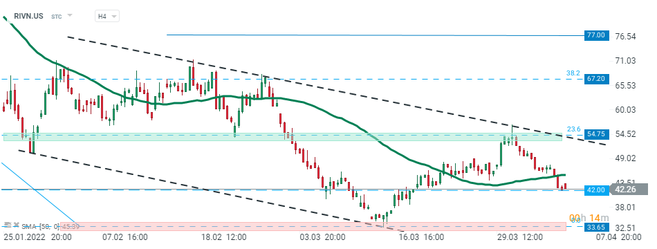 Il prezzo delle azioni Rivian (RIVN.US) è rimbalzato dal limite superiore del canale discendente alla fine di marzo e ha raggiunto il supporto locale a $ 42,00, segnato dalle precedenti reazioni dei prezzi. Se venisse superato, il movimento al ribasso potrebbe accelerare verso $ 33,65 dove si trovano i minimi di marzo. Tuttavia, se la situazione dovesse cambiare, potrebbe iniziare un altro movimento al rialzo verso la resistenza a 54,75$. Fonte: xStation5